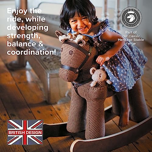 FUN FEATURES: Chester & Fred Rocking Horse stands proudly on his walnut stained bow rocking base, with a contrasting pale end grain. He is dressed smartly in a classic coffee & gold woven hounds tooth fabric, and wears a softly padded brown leatherette saddle and bridle. He features a scrunchy faux suede mane & tail. He comes complete with Fred Bear, a small soft teddy bear toy who sits in his pocket but can be removed and taken anywhere your toddler chooses!