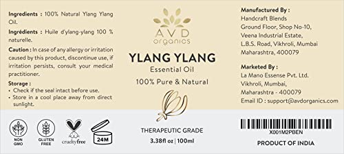 AVD Organics Ylang Ylang Essential Oil 100ml – Premium Quality Therapeutic Grade Essential Oil for Aromatherapy and Skincare – 3.38 fl. Oz